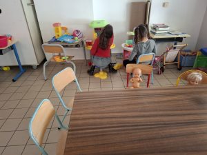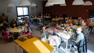Entre midi et deux les enfants qui mangent au 2ème service ont accès, avant le repas, à une salle où ils peuvent jouer, bricoler, lire en tout autonomie